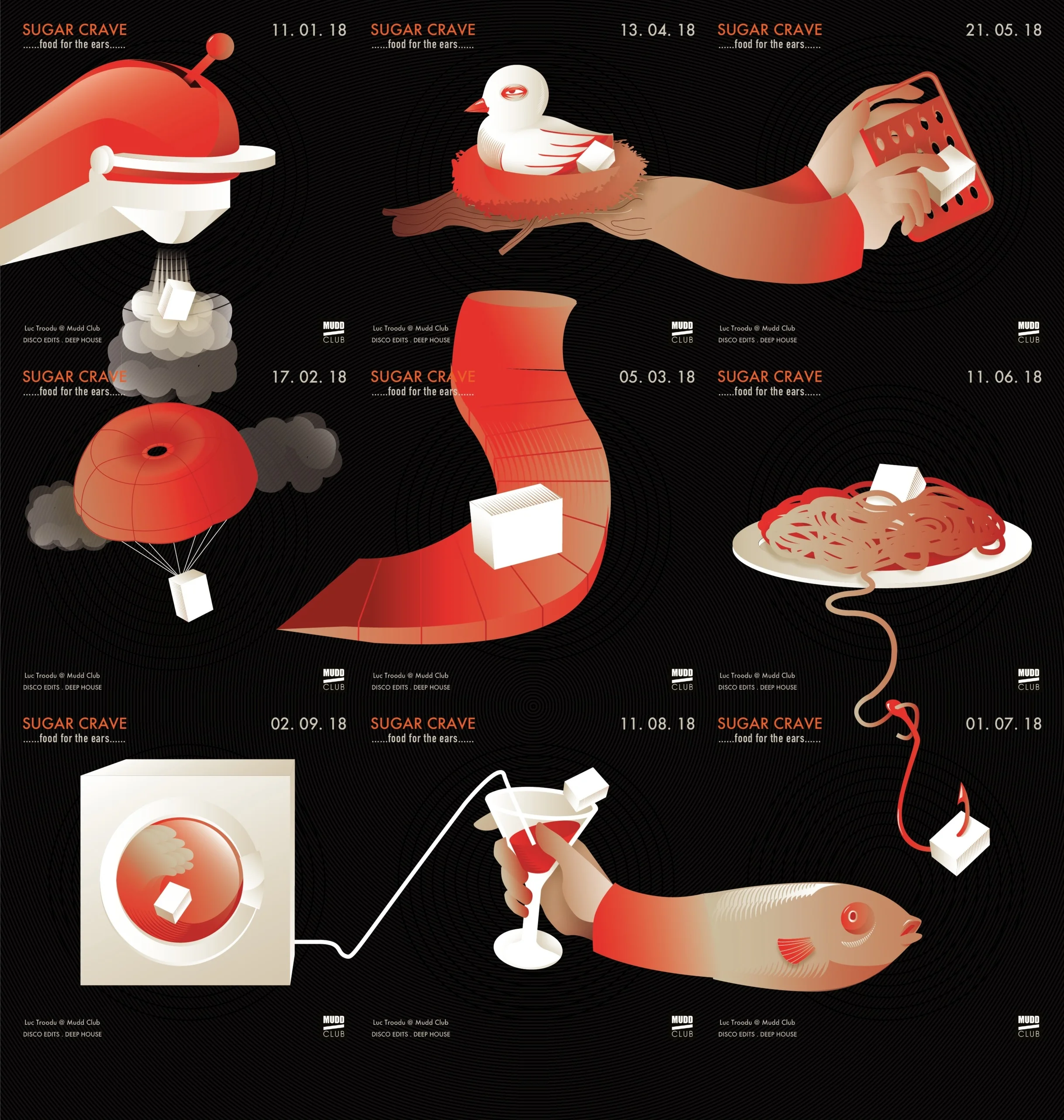 Sugar Crave is a French musician who plays alternative music. He performs every month at the Mudd Club. He hired me to produce some marketing materials; collectable stickers and pamphlets. The main idea was to advertise and create a collection of illustrations, printed on stickers, that people could obtain every gig they attend. At the end of the year they could join the collected stickers together to form a poster or stick them anywhere they wanted. Here is a sample of the project.